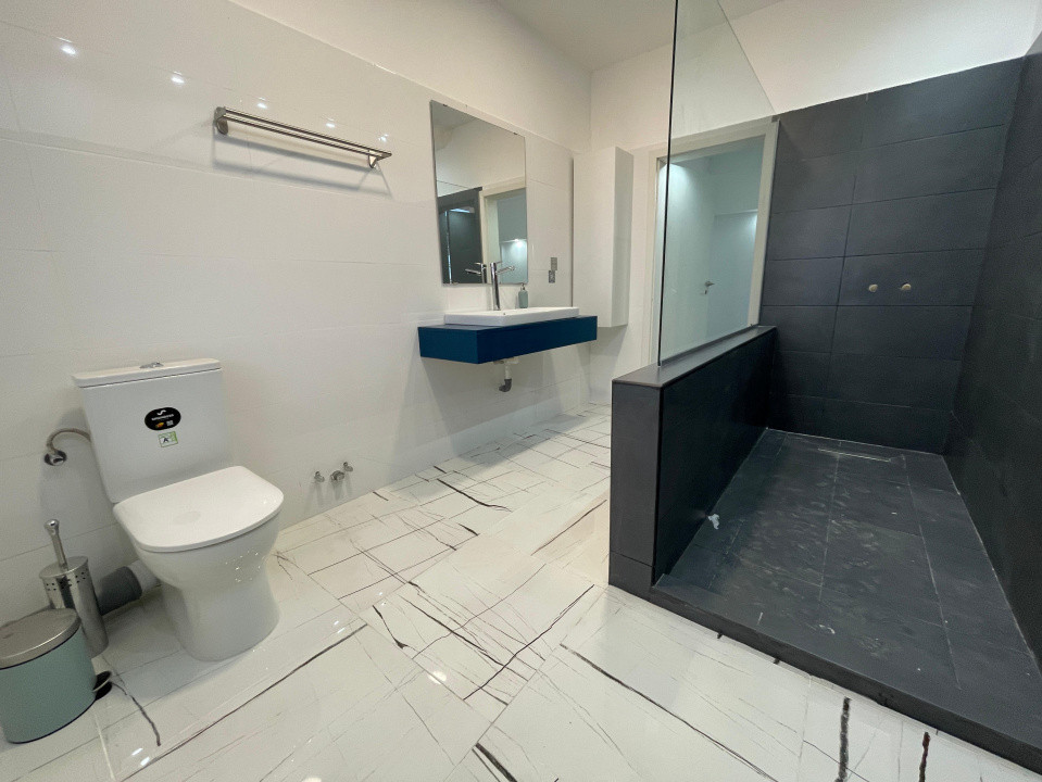 La parter se află 3 băi, 2 dormitoare matrimoniale, living, bucătărie cu cămară, spălătorie, cameră tehnică și 3 terase;